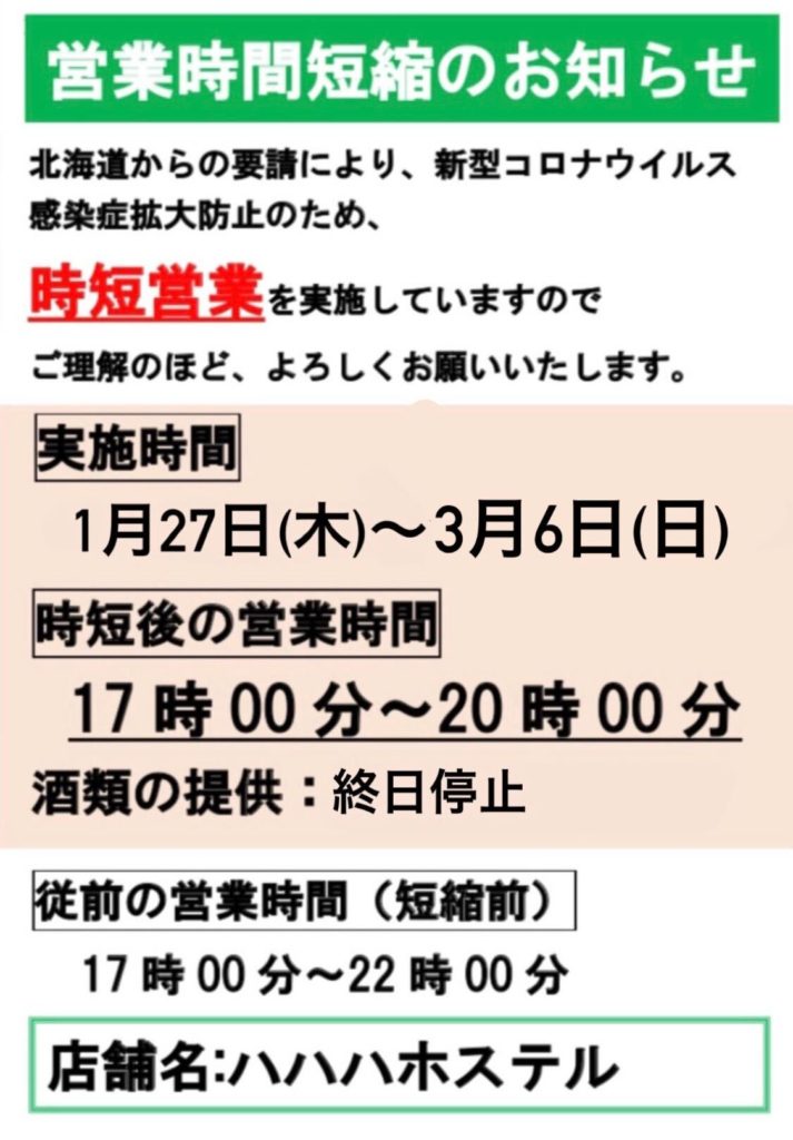 北海道からの要請により、新型コロナウイルス感染症拡大防止のため、
